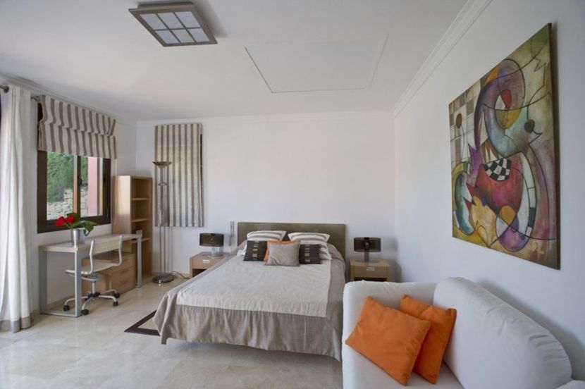 Spolja je bela, dok su unutra svetliji, beli ili bež tonovi, koje Đokovići povremeno „razbijaju“ detaljima, poput veoma crvenih stolica u kuhinji ili sa bojom lavande u prostranoj dnevnoj sobi. Doduše, jedna od spavaćih soba u potpunosti odudara od ostalih umerenih tonova, jer je obojena u jarko žutu boju.