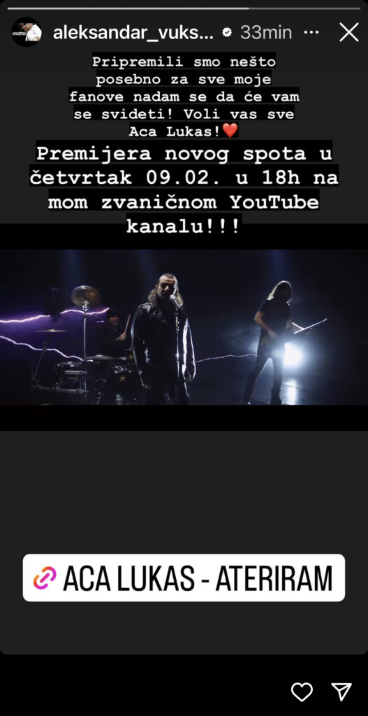 -Pripremili smo nešto posebno za sve moje fanove, nadam se da će vam se svideti. Voli vas sve Aca Lukas. Premijera novog spota u četvrtak 09.02. u 18h na mom zvaničnom Jutjub kanalu- napisao je Lukas na svom Instagram profilu.