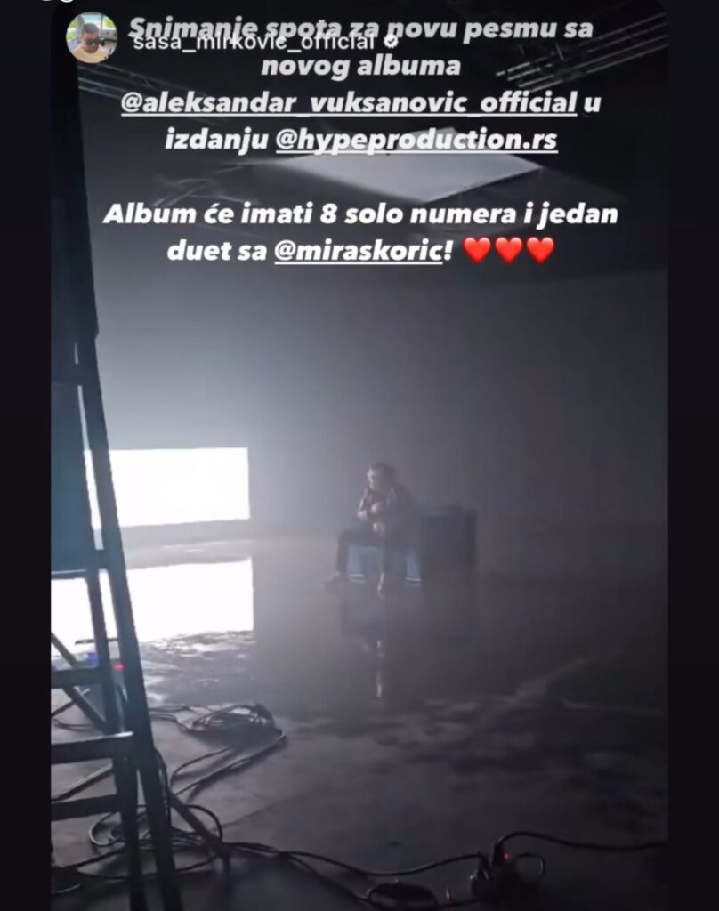 „Snimanje spota za novu pesmu sa novog albuma Aleksandra Vuksanovića u izdanju Hype produkcije. Album će imati osam solo numera i jedan duet sa Mirom Škorić“, stoji u objavi uz sliku sa snimanja.