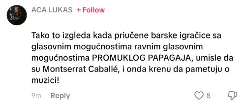 -Tako to izgleda kada priučene barske igračice sa glasovnim mogućnostima, ravnim glasovnim mogućnostima promuklog papagaja, umisle da su Monserrat Caballe i onda krenu da pametuju o muzici.