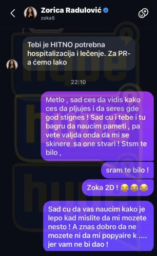 – Tebi je hitno potrebna hospitalizacija i lečenje. Za PR-a ćemo lako – napisala je Zoka 2D kako ju je Lukas nazvao.