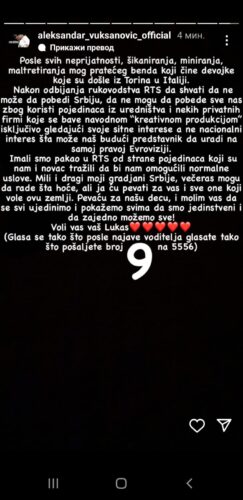 – Mili i dragi moji građani Srbije, večeras mogu da rade šta hoće, ali ja ću pevati za vas i sve koji vole ovu zemlju. Pevaću za našu decu i molim sve da se ujedinimo i pokažemo da zajedno možemo sve. Voli vas vaš Aa Lukas – napisao je pevač na Instagramu.