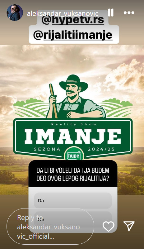 Naime, pevač je podelio objavu novog rijalitija putem Instagram storija i upitao svoje fanove da li bi voleli da ga vide među učesnicima. Ovim potezom, Lukas je izazvao pravu pometnju i stavio do znanja da bi možda i on mogao zakoračiti u ovaj format koji obećava da će biti nešto potpuno novo na našim prostorima.