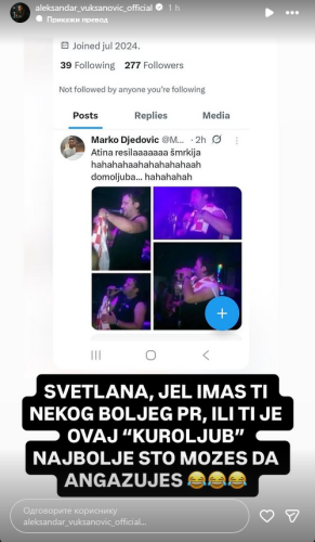 – „Svetlana, jel imaš ti nekog boljeg PR-a ili ti je ovaj Kuroljub najbolje što možeš da nađeš? – napisao je Aca na svom instagram storiju.