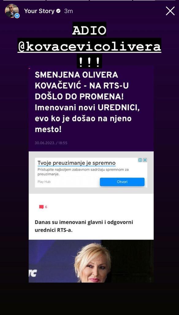 Na svom Instagram nalogu, Mirković nije krio svoje oduševljenje smenom Kovačevićeve, napisavši jednostavno „ADIO Olivera Kovačević!!!“.