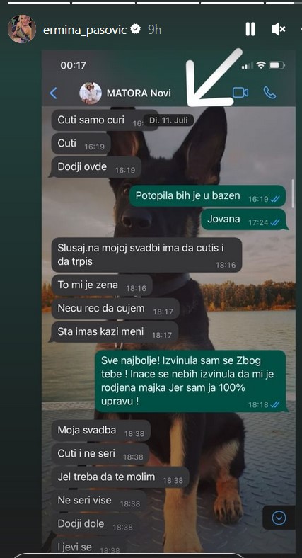 – Eh ovako, očigledno ne može drugačije! Dva dana pred svadbu sam ja već bila u Baru – Kod Vuka i njegove mame i to nije tajna da živim kod njih kada sam u Beogradu, više puta sam to govorila u emisijama. Noć pred svadbu sam okačila stori iz auta kako idemo u Budvu: Desingerica, njegova supruga, Vuk i ja. Ko je koga je**o ili je trebao?! Nije bila tema! Svađa se desila isključivo između mene i Anite vezano za šminku, zašto?! Desilo se jer je Matora platila kumi, Anitinoj tetki, Tijani Ajfon i kao Rešićki, gde sam ja rekla: „Divno, koliko se ja sećam ja šaljem svaki put šakom i kapom kada su u Zadruzi, a nisu se setili da me pitaju“. Ja ne bih ni prihvatila i tu sam ja nalepila Anitu. Nek si uvalila tetku i ostale i ko je ona da određuje sa Matorinim parama i rekla sam joj: „Rijaliti može da igra sa njima, sa mnom ne“ i sasula joj sve u lice – napisala je vidno besna Ermina, te je na narednom storiju najavila obelodanjivanje jedne od njenih prepiski sa Matorom.