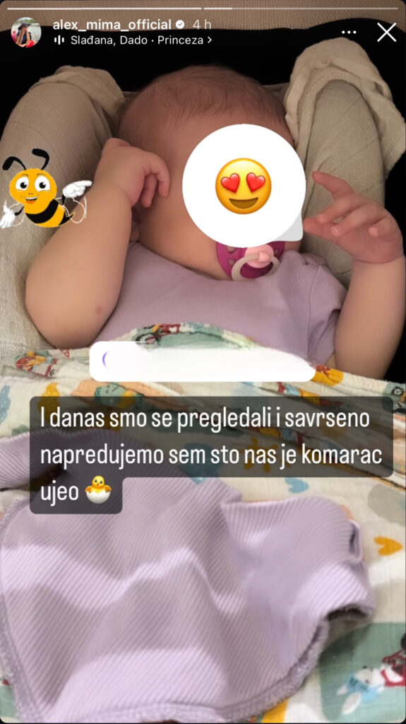 “I danas smo se pregledali i savrseno napredujemo sem sto nas je komarac ujeo”., napisala je Aleks na fotki bebe n kojoj se jasno vidi ujed komarca o kom je i pričala.