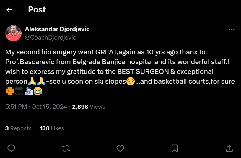 „Moja druga operacija kuka je prošla odlično kao i pre 10 godina. Hvala profesoru Baščarevu iz bolnice na Banjici i njenom divom osoblju. Želim da izrazim zahvalnost najboljem hirurgu i izuzetnoj osobi. Vidimo se uskoro na ski stazama. I košarkaškim terenima svakako“, napisao je Đorđević na društvenoj mreži „Iks“.