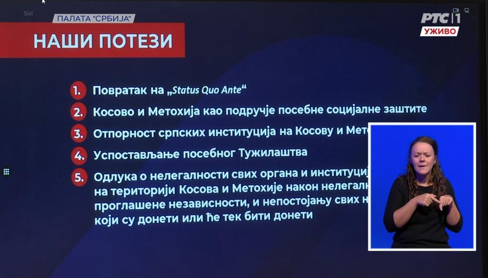 – U okviru prve tačke pokrenućemo susret sa 60 svetskih lidera i svakom lideru dostaviću sve papire koje smo i sad dostavili, i dodatno papire. Svim članicama Saveta bezbednosti i Putinu i Si Đinpingu. Govorim o 60 premijera i predsednika zemalja do kraja novembra. Uručiću i 11 odlikovanja onima koji su pomogli u borbi i lično ih uručiti u Njujorku. Od kineskih, ruskih prijatelja, Nikaragve, Konga, Emirata. Da pokažemo zahvalnost i da ne zaboravljamo one koji su nam u teškim situacijama pomogli.