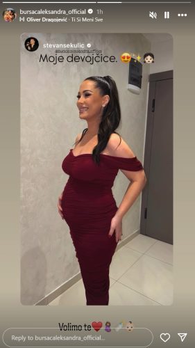 Naime, Aleksandra je na slici u uskoj bordo haljini, a trudnički stomak je u prvom planu, dok je evidentno da joj ovo stanje prija, te ne skida osmeh sa lica.
