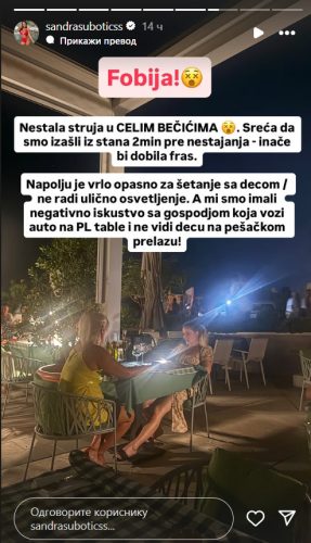 „Srećom struja je došla! Ali vreme je horor – duva izrazito jako topao vetar, bukvalno se znojiš dok šetaš – kao da ste u paklu – ne znam kako bi drugačije opisala, totalno neprirodno“, kaže Subotićeva, koja je imala jak filter na Instagram storiju.