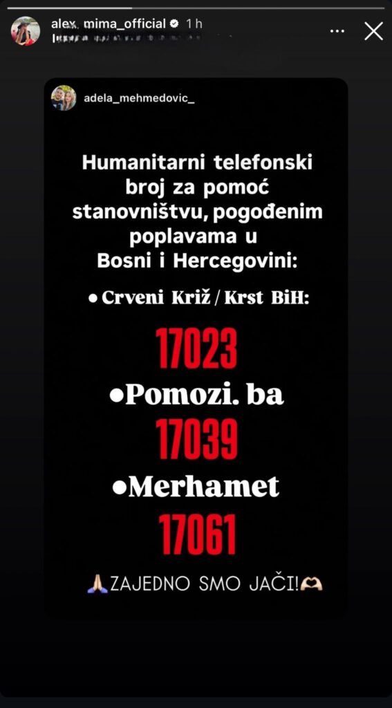 –Humanitarni telefonski broj za pomoć stanovništvu, pogođenim poplavama u Bosni i Hercegovini. Zajedno smo jači – pisalo je u objavi.