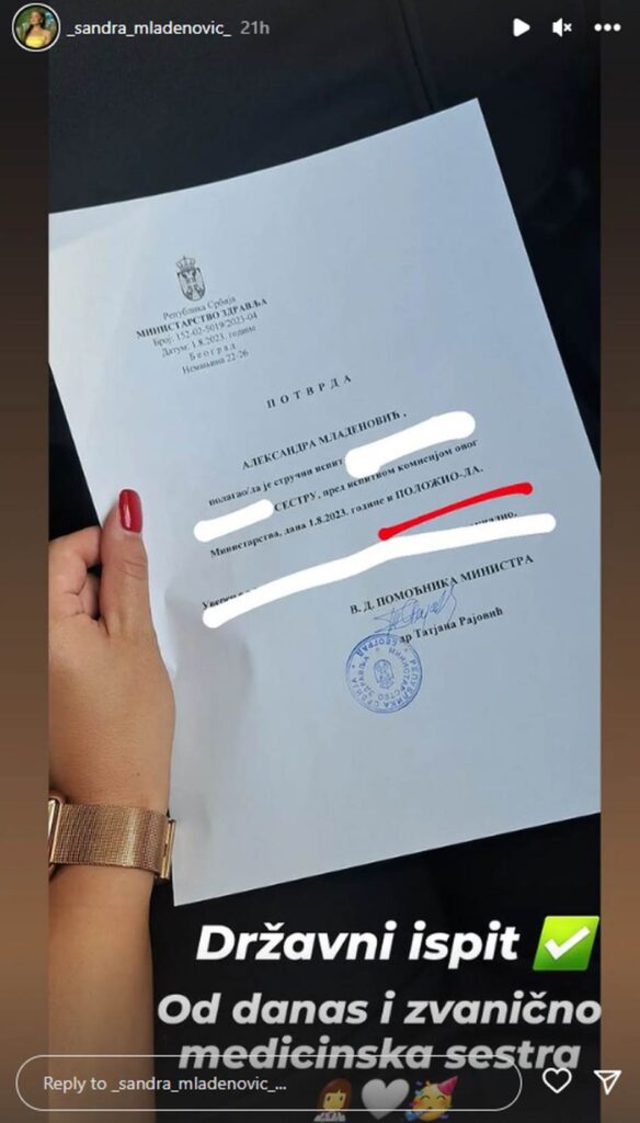 „Državni ispit položen. Od danas i zvanično medecinska sestra„, napisala je Sandra ponosno uz fotografiju sertifikata kojim se pohvalila na Instagramu, pa joj čestitke samo pristižu.