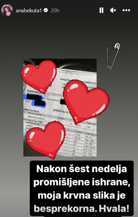 Pevačica Ana Bekuta se već neko vreme pridržava zdrave ishrane, a sada je otkrila da je njen trud urodio plodom. Bekuta je na svom Instagram profilu, naime, podelila nalaze krvi, pa otkrila da je, zahvaljujući izbalansiranoj ishrani, sve u najboljem redu.