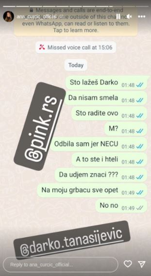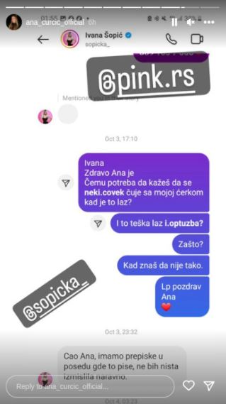 – Ivana zdravo, Ana je. Čemu potreba da kažeš da se neki čovek čuje sa mojom ćerkom kad je to laž? I to teška laž i optužba. Zašto? Kad znaš da nije tako. Lep pozdrav, Ana – napisala je Ćurčićeva, a Ivana joj je odgovorila.