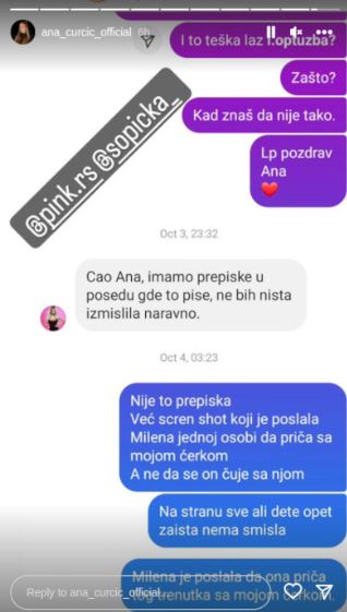 – Nije to prepiska, već skrinšot koji je poslala Milena jednoj osobi da priča sa mojom ćerkom. A ne da se on čuje sa njom. Na stranu sve, ali dete, opet zaista nema smisla. Milena je poslala da ona priča tog trenutka sa mojom ćerkom – odgovorila je Ana.