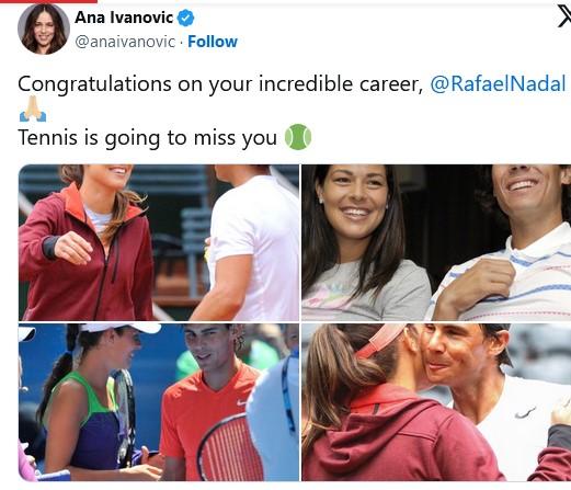 – Čestitam ti na tvojoj izuzetnoj karijeri, Rafa. Nedostajaćeš tenisu – napisala je Ana Ivanović, uz objavljivanje nekoliko njihovih zajedničkih fotografija.