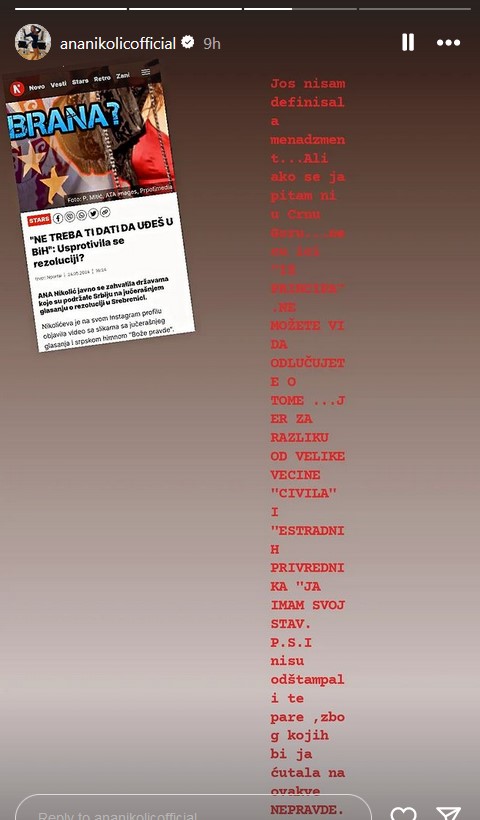 Ana Nikolić očigledno nije razmišljala kada je pre nekoliko dana na svom Instagram profilu javno zahvalila državama koje su podržale Srbiju na glasanju o rezoluciji o Srebrenici. Zbog svog stava, ona se našla na meti pojedinaca koji su je napali. I umesto da je ćutala, pevačica je ušla u konflikt, pa počela da preti!