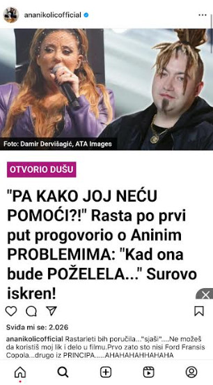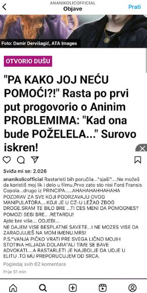 – Rastarleti bih poručila… „sjaši“… Ne možeš da koristiš moj lik i delo u filmu. Prvo zato što nisi Ford Fransis Kopola. Drugo iz principa ahaha… Pozdrav za sve koji podržavaju ovog manipulatora koji je u CZ-u ležao zbog droge. Sram te bilo bre. Ti ćeš meni da pomogneš? Pomozi sebi bre retardu! Ajde bre više o*jebi! Ne dajem više besplatne savete i ne možeš više da zarađuješ na mom imenu! Mrš! P.S.: Vanja, p*čko, vrati pre svega, lično mojih stotina hiljada evra, ali time se bave advokati. A Rastarleti je najbolje da uđe u „Elitu“. To mu preporučujem od srca – napisala je ogorčena Ana.