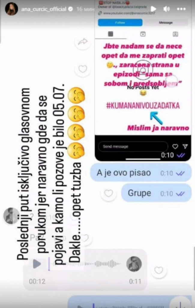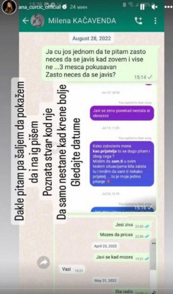 Danas je na društvenoj mreži Instagram objavila privatne prepiske sa Milenom, gde se vidi da ju je Kačavenda ignorisala i 2022. godine, iako joj se Ćurčićeva javila. Kako je Ana otkrila, ovo je trajalo tri meseca.