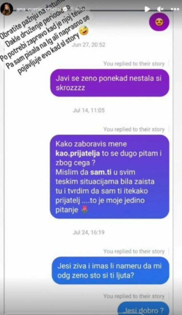 – Kako zaboraviš mene kao prijatelja, to se dugo pitam i zbog čega? Mislim da sam ti u svim teškim situacijama bila zaista tu i tvrdim da sam ti i te kako prijatelj. To je moje jedino pitanje – pisala je Ana 14. jula.