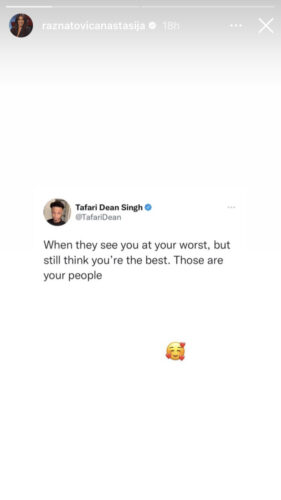 Pod budnim su okom javnosti a mediji prate svaki njihov korak i sitnicu koja bi mogla da oda kako zapravo ta ljubav funkcioniše. I čini se da smo netremice dobili odgovor. Pre nekoliko minuta, Anastasija je u svojoj Instagram priči objavila rečenicu koja bi mogla da bude odgovor na to kako funkcioniše veza sa Nemanjom i kako se on prema njoj ponaša…