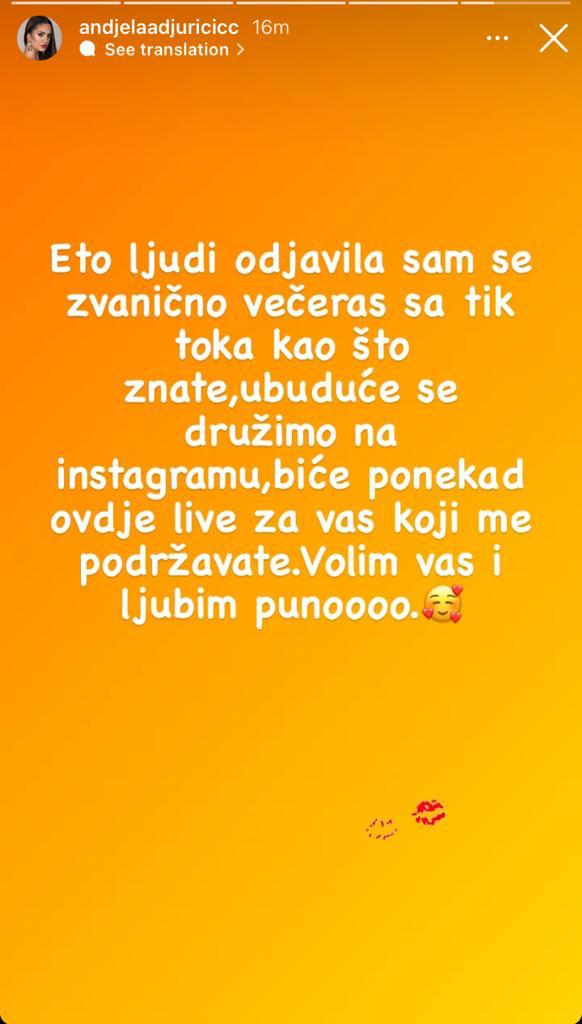 Putem svog Instagram profila, Anđela se obratila svojim pratiocima i zvanično obavestila o svom povlačenju sa TikToka.