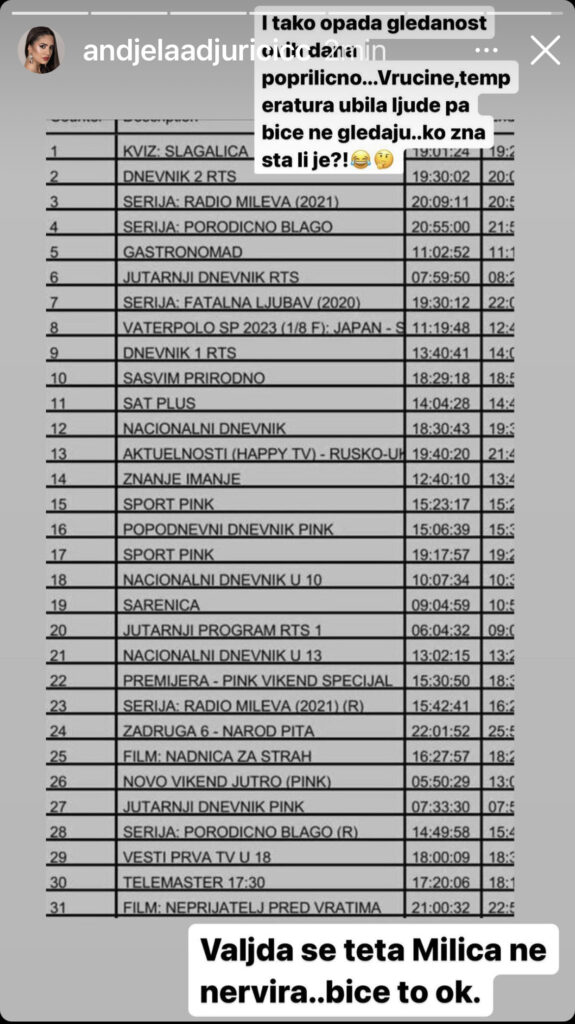 -I tako opada gledanost ovih dana poprilično… Vrućine, temperatura ubila ljude pa biće ne gledaju… ko zna šta li je?! – napisala je Anđela, pa dodala: