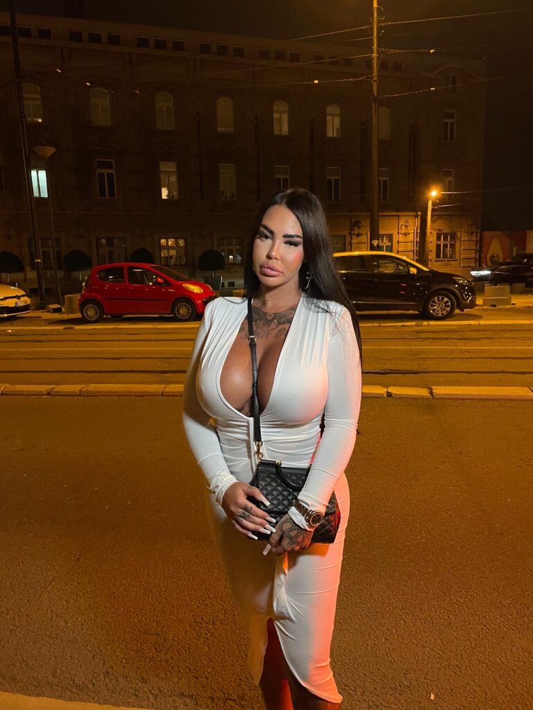 Pojavila se u beloj, uskoj haljini koja je savršeno ocrtavala njenu figuru, dok je duboki dekolte dodatno istakao njene silikonske grudi.