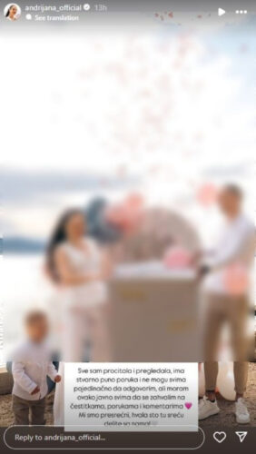 – Sve sam pročitala i pregledala, ima stvarno puno poruka i ne mogu svima pojedinačno da odgovorim, ali moram ovako javno svima da se zahvalim na čestitkama, komentarima. Mi smo presrećni, hvala što tu sreću delite sa nama – istakla je ona u okviru svojih „storija“.