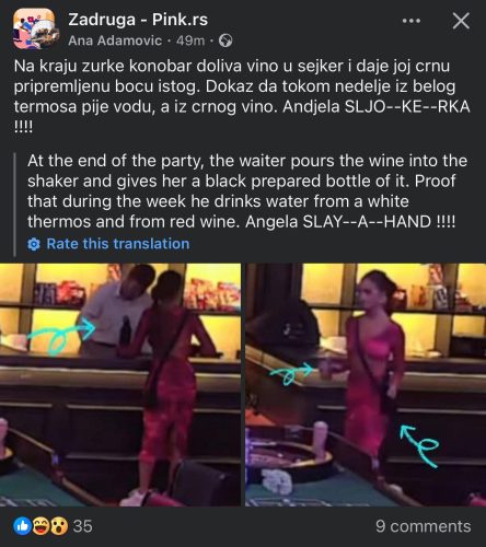 – Na kraju žurke konobar doliva vino u šejker i daje joj crnu pripremljenu bocu istog. Dokaz da tokom nedelje iz belog termosa pije vodu, a iz crnog vino. Anđela šljokerka! – glasio je jedan od komentara.