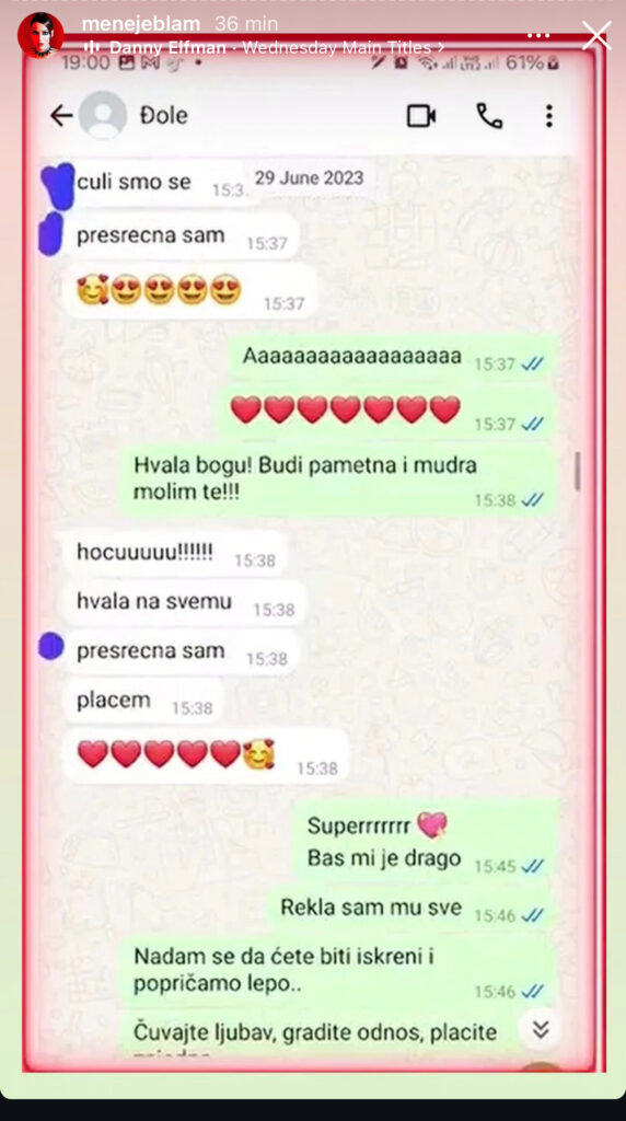 Kao što se vidi u porukama, nije Zvezdan taj koji je nju zvao već ona njega. Pa je i preko njegovih prijatelja dolazila do njega. Dok je svima govorila o nasilju i maltretiranju kao i sada u rijalitiju.
