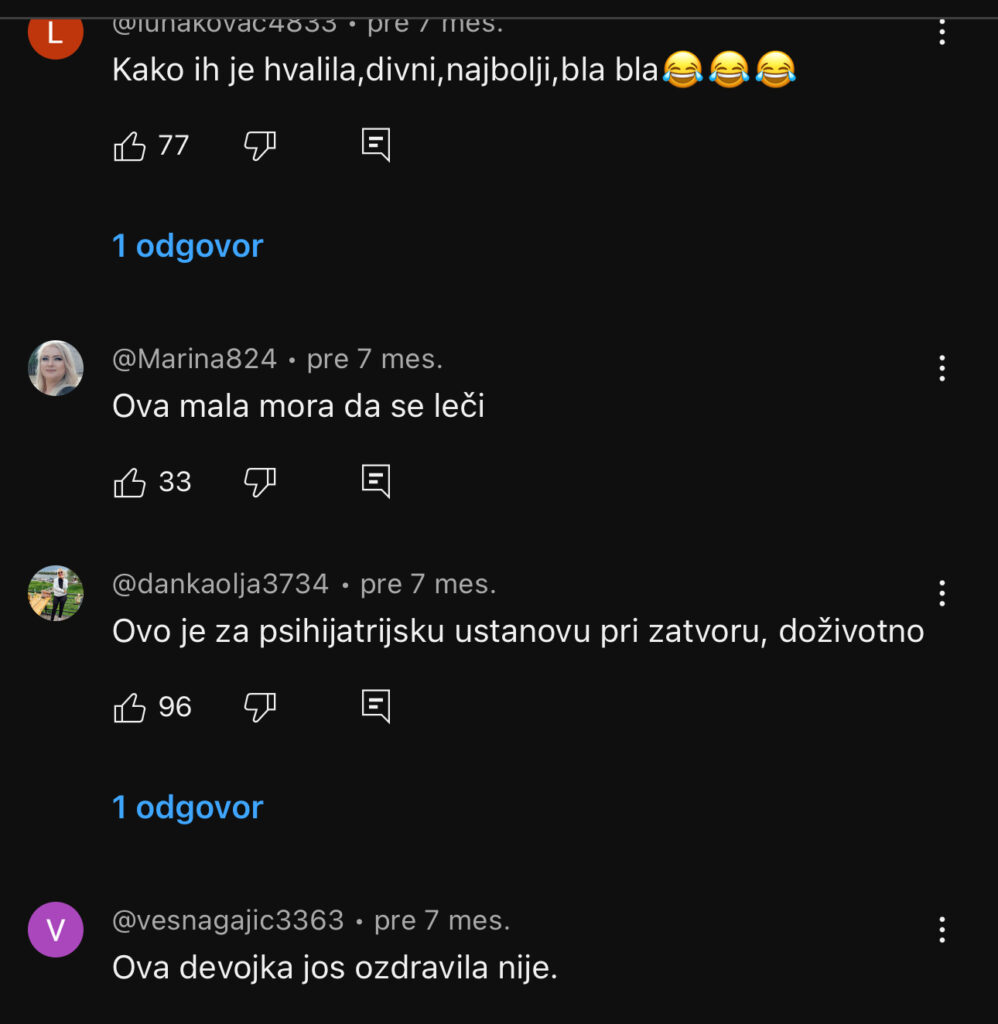 “Ova devojka mora da se leči”., “Koliko ih je hvalila, divni najbolji”., “”Ova devojka još nije izdravila”., “Ovo je za psihijatrijsku ustanovu pri zatvoru. Doživotno”., samo su neki od komentara razočarane podrške.