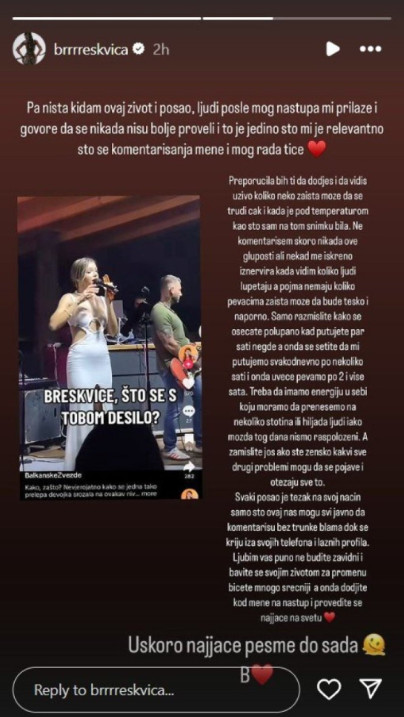 – Pa ništa kidam ovaj život i posao, ljudi mi prilaze posle nastup i govore mi da se nikad bolje nisu proveli i to mi je jedini relevantan komentar mog rada. Preporučila bih ti da dođeš i da vidiš uživo. Koliko neko zaista može da se trudi čak i kad je pod temperaturom, kao što sam ja bila na tom snimku. Ne komentarišem skoro nikada ove gluposti, ali nekada me iskreno iznervira kada vidim koliko ljudi lupetaju, a nemaju pojma koliko pevačima zaista može da bude teško i naporno – napisala je Breskvica, pa nastavila da jadikuje: