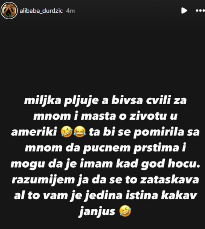 – Miljku pljuje, a bivša cvili za mnom i mašta o životu u Americi. Ta bi se pomirila sa mnom da pucnem prstima i mogu da je imam kad hoću. Razumem ja da se to zatašlava al to vam je jedina istina. Kakav Janjuš – glasila je njegova objava na Instagramu.