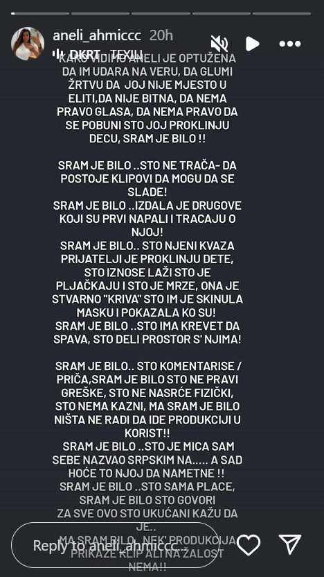 „Kako vidimo, Aneli je optužena da im udara na veru, da glumi žrtvu. Da joj nije mesto u rijalitiju, da nije bitna i nema pravo glasa. Nema pravo da se pobuni što joj proklinju decu, sram je bilo!“, započeto je.
