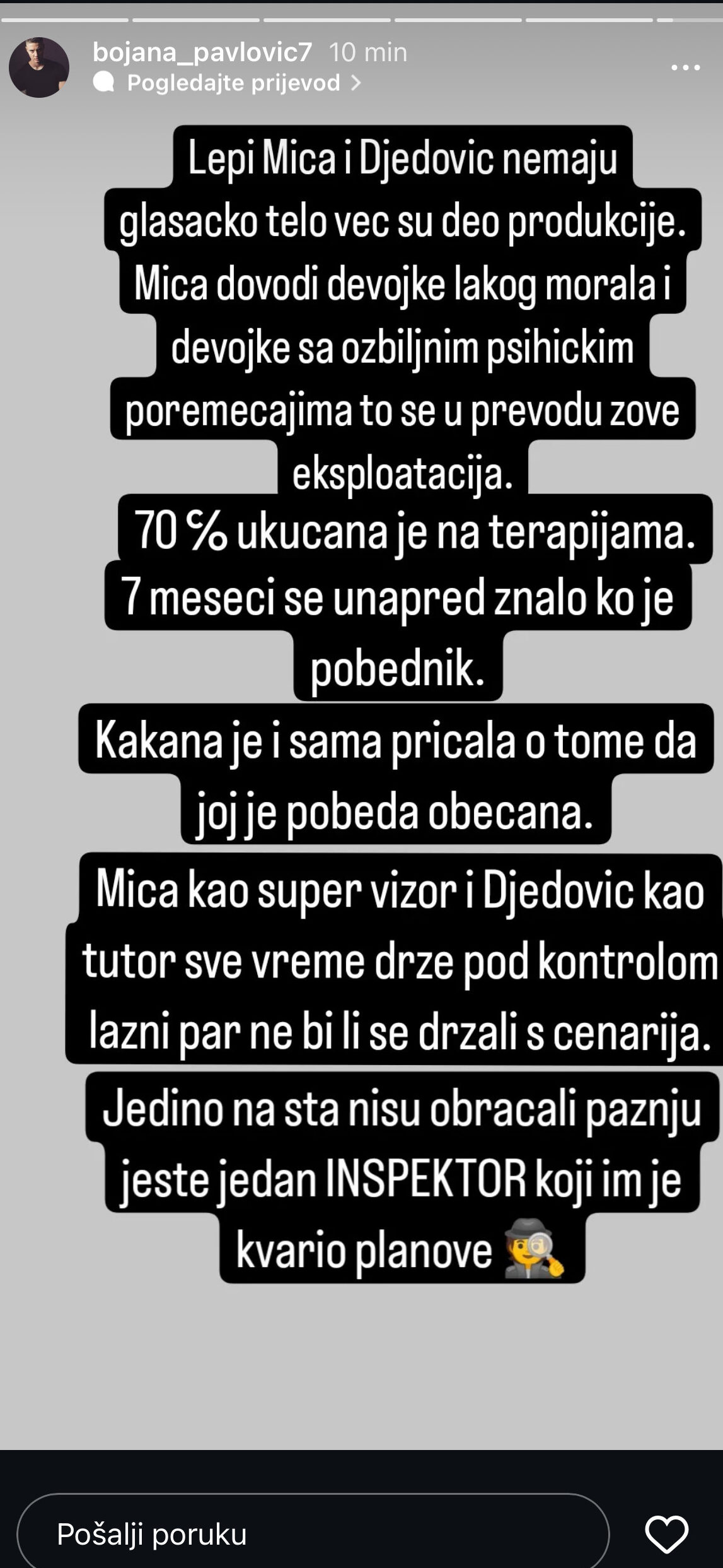 “7 meseci se unapred znalo ko je pobednik. Kakana je i sama pričala o tome da joj je pobeda obećana. Mića kao supervizor i Djedović kao tutor sve vreme drže pod kontrolom lažni par ne bi li se držali scenarija. Jedino na šta nisu obraćali pažnju jeste jedan INSPEKTOR koji im je kvario planove”., napisala je Bojana.