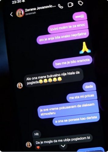 – Večera je bila posebnog tipa. Bila je pozvana Zorannah, Adriana Kadar, još neki ljudi… Imao sam biznise sa strane, promovisao neke proizvode. Organizovao sam večeru za sve njih kao dobar agent. Dolazi Zorannah, ja sve vreme bacam neke forice, a Anja sve vreme Zoranu ovako (strelja pogledom). I celo veče Anja petardira Zoranu komentarima, ponaša se kao da je iz šume došla. Posle sam joj jeb… majku. Sram je bilo. Skroz ono normala priča, nisam muvao Zoranu, bacao fore, promoviše mi proizvode – objasnio je Baka pozadinu ovih poruka.