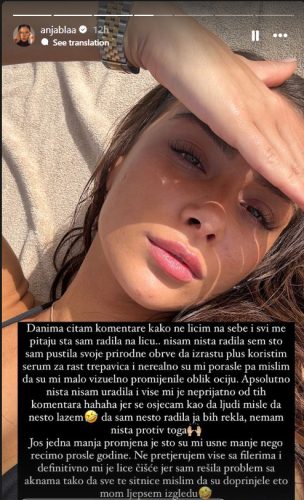 -Danima čitam komentare u kojima pišu da ne ličim na sebe i svi me pitaju šta sam radila na licu. Istina je da apsolutno ništa nisam radila – započela je iskreno influenserka Anja Bla.
