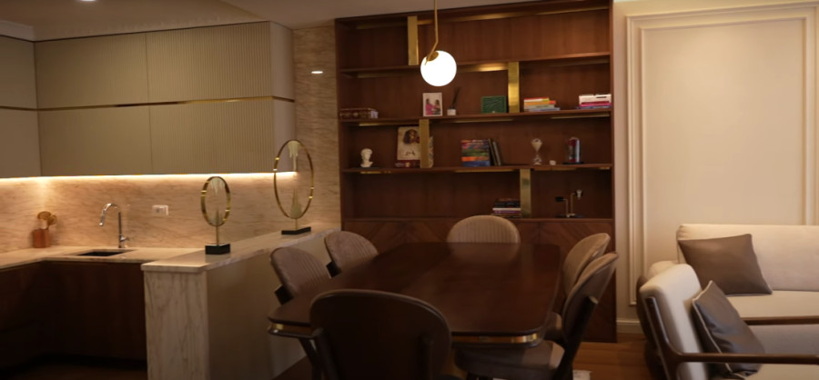 Dnevna soba odiše elegancijom, sa garniturom u bež boji i braon stolom, dok veliki TV i gipsani ukrasi na zidu upotpunjuju prostor.