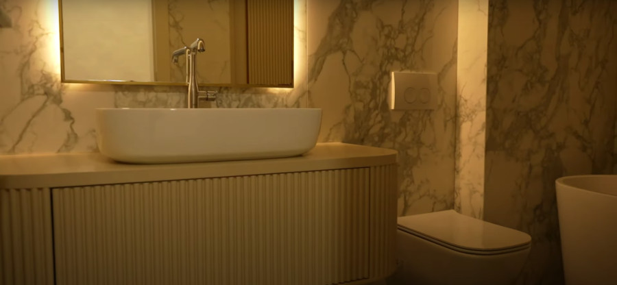 Posebno su zanimljivi detalji u dva kupatila, jedno manje i drugo veće, sa prelepom kadom i bež akcentima.