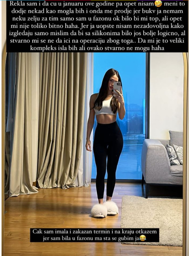 – Meni to dođe nekad, kao mogla bih i onda me prođe, jer bukvalno ja nemam neku želju za tim, samo sam u fazonu da bi mi bilo top, ali opet mi i nije toliko bitno. Ja uopšte nisam nezdadovoljna kako izgledaju moje grudi, samo mislim da bi sa silikonima bilo još bolje, ali mi se stvarno ne ide na operaciju zbog toga. Da mi je to veliki kompleks išla bih, ovako ipak ne – obajsnila je influenserka.