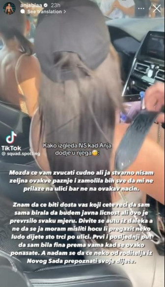 – „Možda će vam zvučati čudno, ali ja stvarno nisam željna ovakve pažnje i zamolila bih sve da mi ne prilaze na ulici, bar ne na ovakav način. Znam da će biti dosta vas koji će reći da sam sama birala da budem javna ličnost, ali ovo je prevršilo svaku meru. Divite se autu izdaleka, a ne da ja mislim da li ću pregaziti neko ludo dete što trči po ulici. Prvi i poslednji put da sam bila fina prema vama kada se ovako ponašate, a nadam se da će neko od roditelja iz Novog Sada prepoznati svoje dete“ – napisala je Anja.