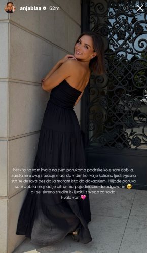 -Beskrajno vam hvala na svim porukama podrške koje sam dobila. Zaista mi u ovoj situaciji znači da vidim kolika je količina ljudi svesna šta se dešava bez da moram išta da dokazujem. Hiljade poruka sam dobila i najradije bih svima pojedinačno da odgovorim, ali iskrenoo trudim se da se isključim iz svega za sada. Hvala vam – poručila je Anja uz emotikon srca.