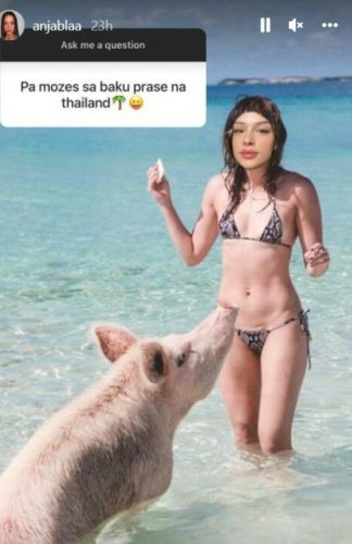 „Povedi Baku Prase na Tajland“, napisao je jedan korisnik. Anja je odgovorila fotografijom na kojoj stoji devojka preko čije glave je zalepila svoj lik i hrani prase.