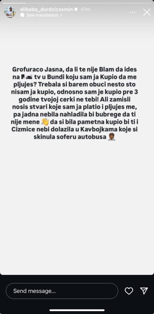 „Grofuračo Jasna, da te nije blam da ideš na televiziju u bundi koju sam ja kupio, da me pljuješ? Trebalo je barem da obučeš nešto što nisam ja kupio pre tri godine tvojoj ćerki, a ne tebi? Ali zamisli nosiš stvari koje sam ja platio i pljuješ me! Pa jadna ne bila, prehladila bi bubrege da ti nije mene!“, napisao je Asmin.
