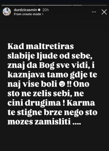 – Kada maltretiraš slabije ljude od sebe znaj da Bog sve vidi i kažnjava tamo gde te najviše boli. Ono što ne želiš sebi, ne čini drugima. Karma te stigne brže nego što možeš zamisliti.. – napisao je Asmin.