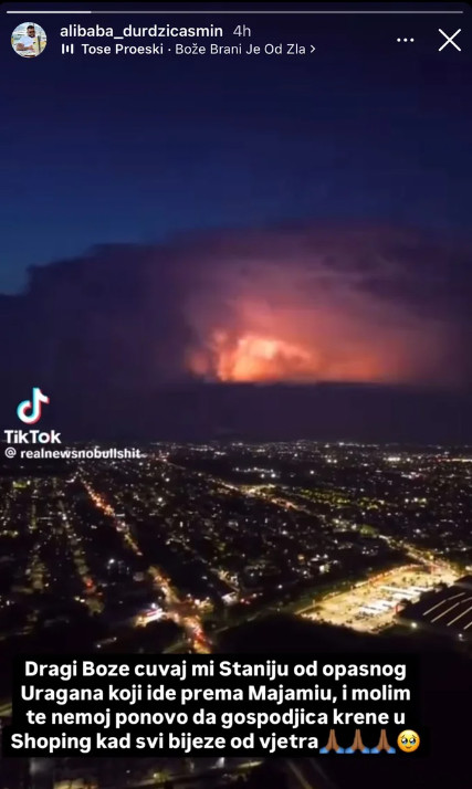 – Dragi Bože, čuvaj mi Staniju od opasnog uragana koji ide prema Majamiju i molim te, nemoj ponovo ga gospođica krene u šoping kad svi beže od vetra – poručio je Asmin Durdžić.
