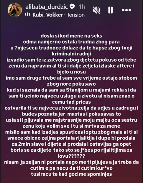 -Kad si saznala da sam sa Stanijom u Majamiju, rekla si da sam ti učinio najveću uslugu u životu, ali nisam znao o čemu tada pričaš. Ostvarila ti se najveća životna želja da uđeš u rijaliti i budeš poznata jer maštaš i pokušavaš to. Ušla si i pljuvala me najstrašnije. Moju majku, oca, sestru ženu koju volim sve i tu si mrtva za mene. Mislio sam kad izađeš, spustićeš loptu zbog male, ali ti si smeće obično željna portala, rijalitija i du*e bi prodala za dva minuta slave. I dete si prodala i ostavijas ga opet. Boris se za deete tako sto se je**š po rijalitijama – dodao je on.