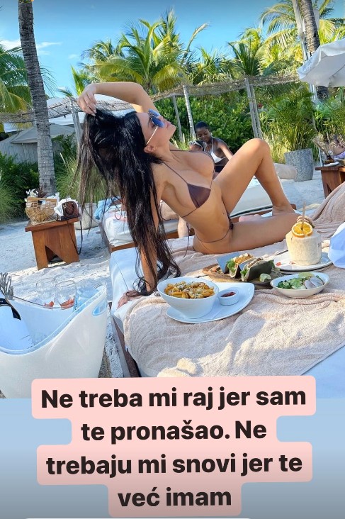 – Ne treba mi raj jer sam te pronašao. Ne trebaju mi snovi jer te već imam – napisao je Asmin u objavi i uz sliku Stanije u izazovnom kupaćem kostimu. Dok uživa u izobilju raznih đakonija koje joj donose na plažu.